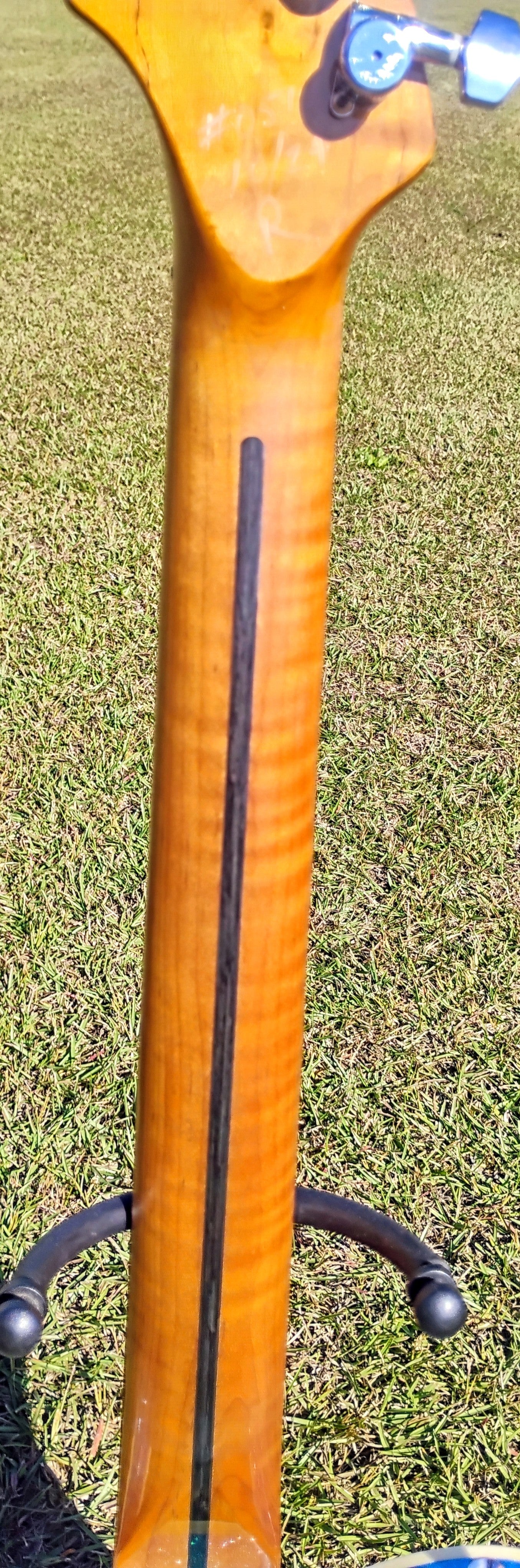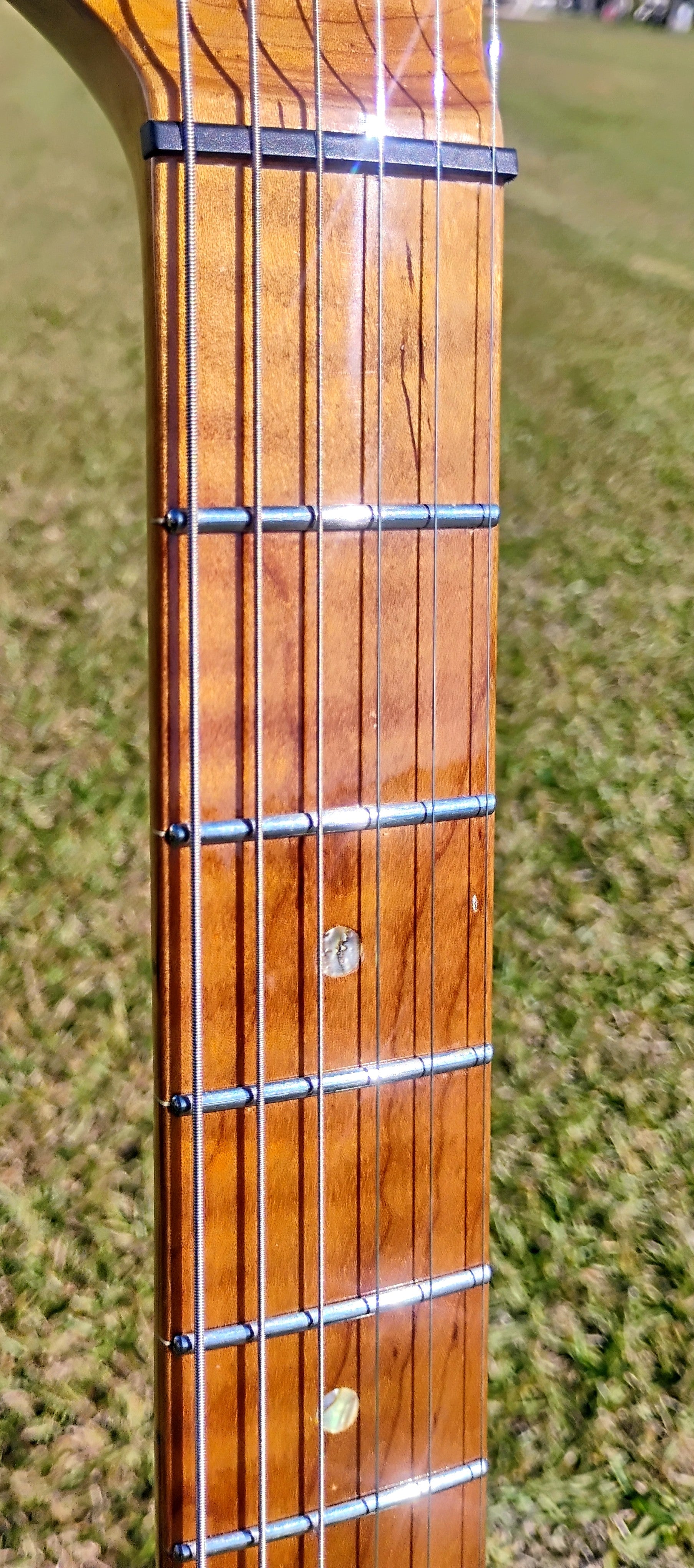 *Gloss finish, roasted flame maple C neck with rounded end stainless steel frets. Back of neck wet-sanded to smooth satin! Fender neck plate. Black Tusq self-lubricating nut. Locking, staggered Hip Shot tuners- mounted with our ergonomic slant! Was able to get a Li'l extreme with our slant👍